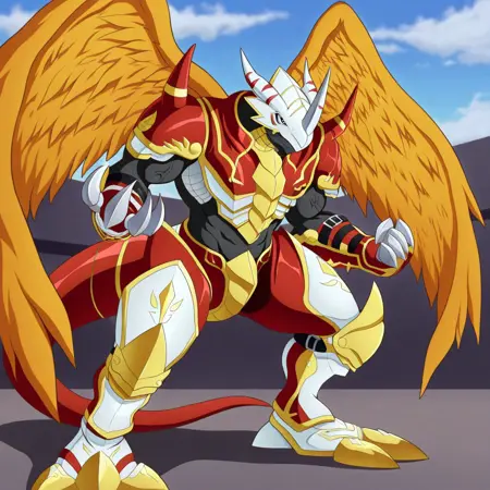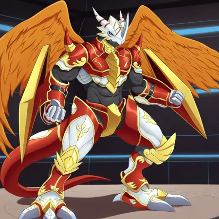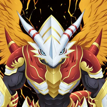 ◇ Vritramon,数码宝贝,龙,翅膀,头盔,盔甲,角,护腕,尾巴,眼睛,嘴巴,肌肉发达,黑色内体,蓝色眼睛,红色眼睛,闭嘴,张嘴,黑色内衬,羽毛翅膀,火焰翅膀,火焰,橙色翅膀,