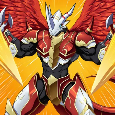 ◇ 브리트라몬, 디지몬, 용, 날개, 헬멧, 갑옷, 뿔, 장갑, 꼬리, 눈, 입, 근육질, 검은 내부 신체, 파란 눈, 빨간 눈, 닫힌 입, 열린 입, 검은 내부, 깃털 날개, 화염 날개, 불, 주황색 날개,