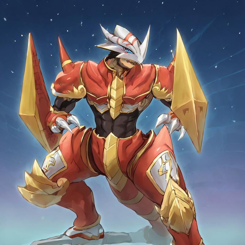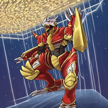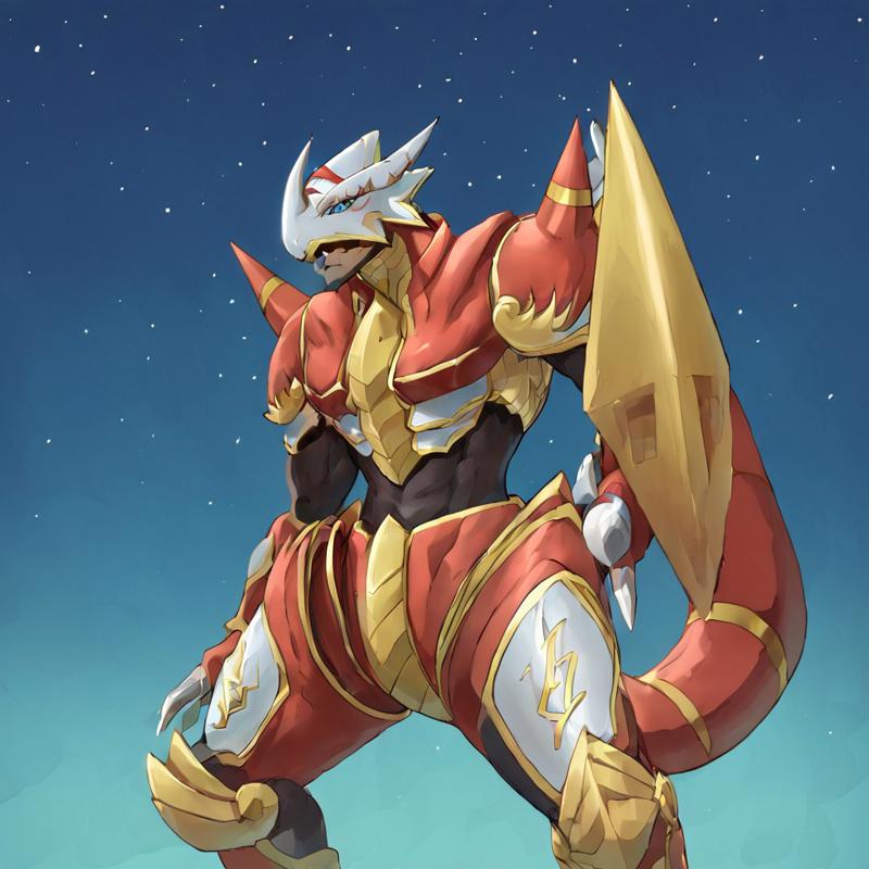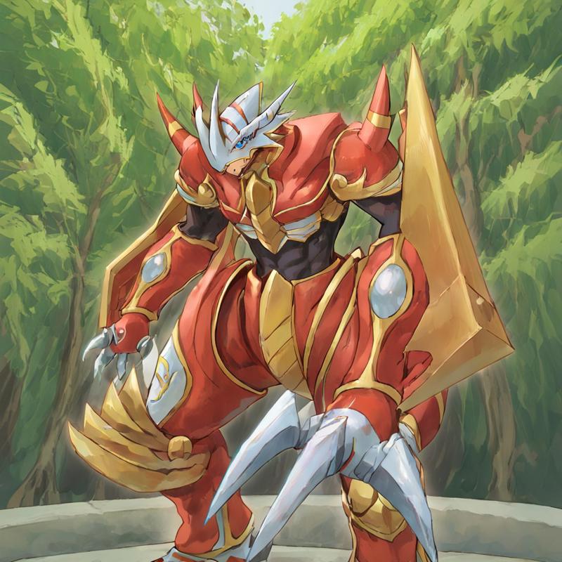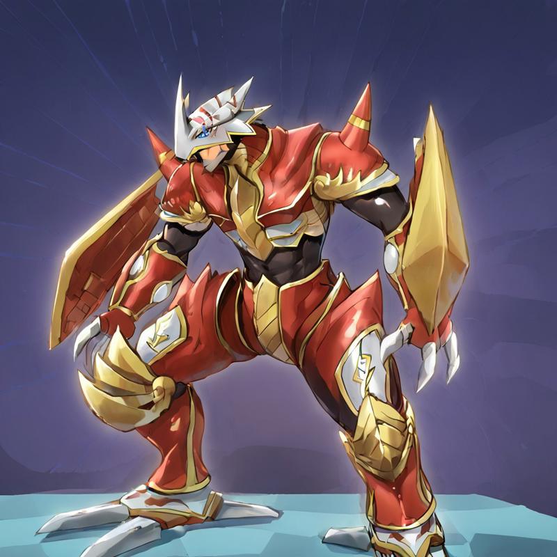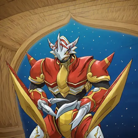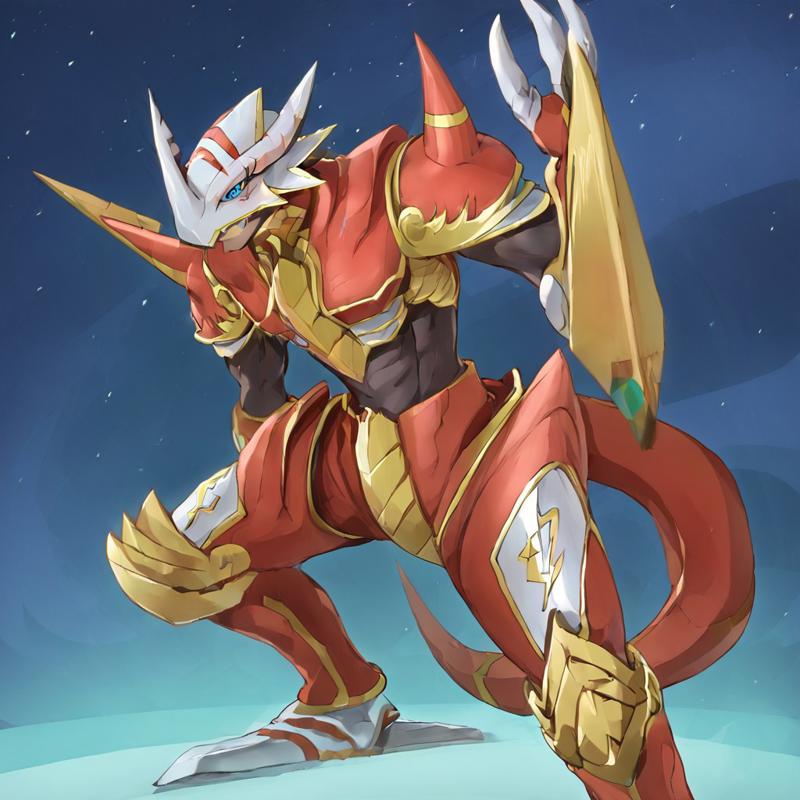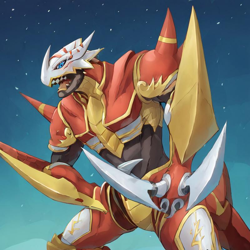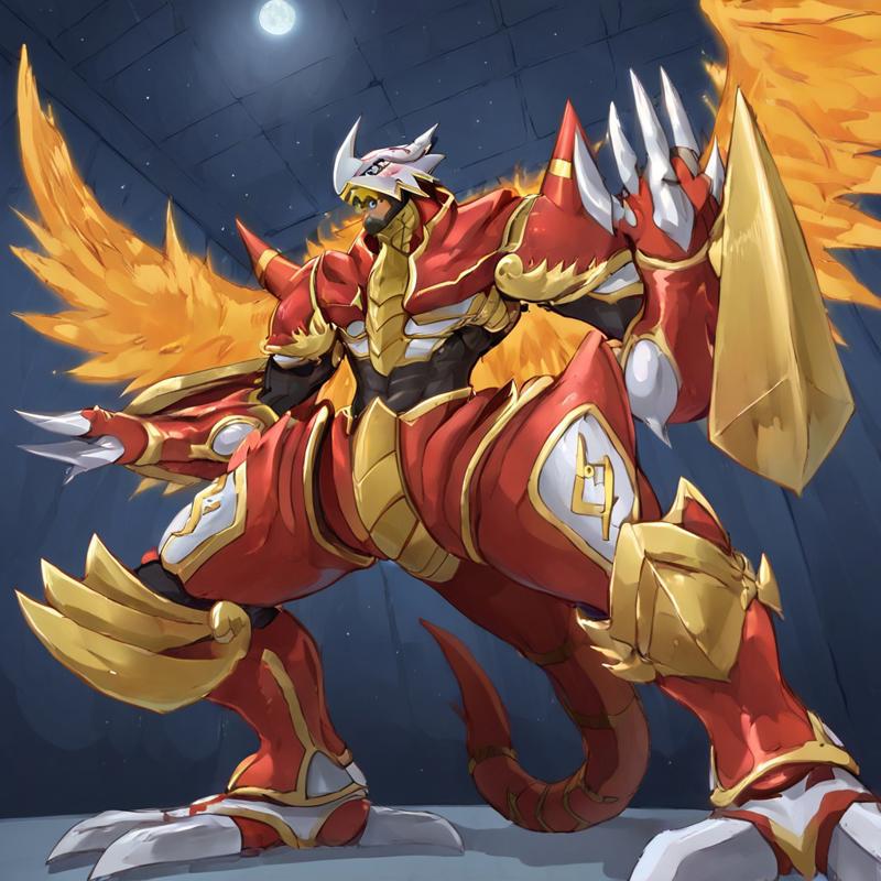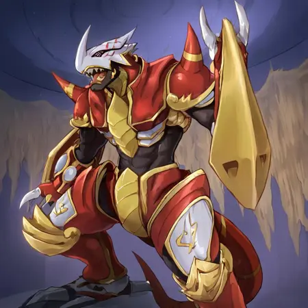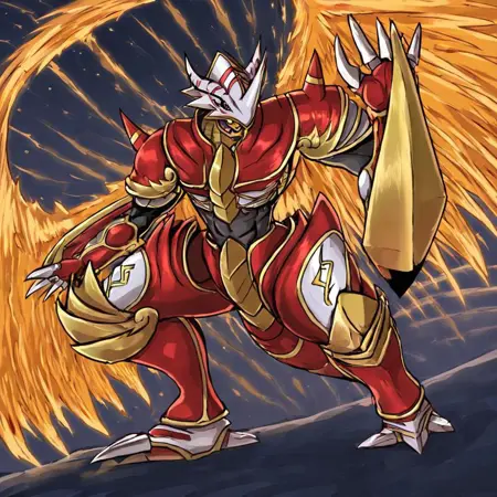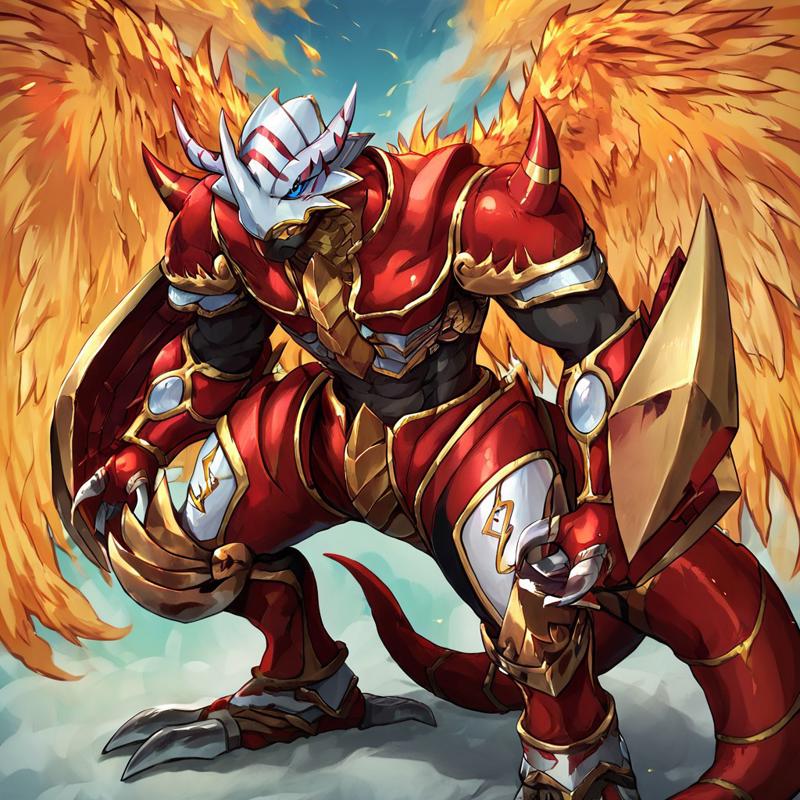 ◇ Vritramon,数码宝贝,龙,翅膀,头盔,盔甲,角,护腕,尾巴,眼睛,嘴巴,肌肉发达,黑色内体,蓝色眼睛,红色眼睛,闭嘴,张嘴,黑色内衬,羽毛翅膀,火焰翅膀,火焰,橙色翅膀,
