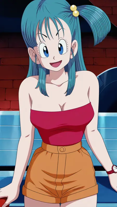 RR army saga, side ponytail, bangs, hair ornament, red shirt, strapless, shirt tucked in, brown shorts, short shorts, bare shoulders, collarbone, watch, cleavage,