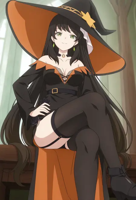 Inori,black hair,very long hair,orange lining,black thighhighs,black footwear,garter straps,off shoulder,flower,witch hat,