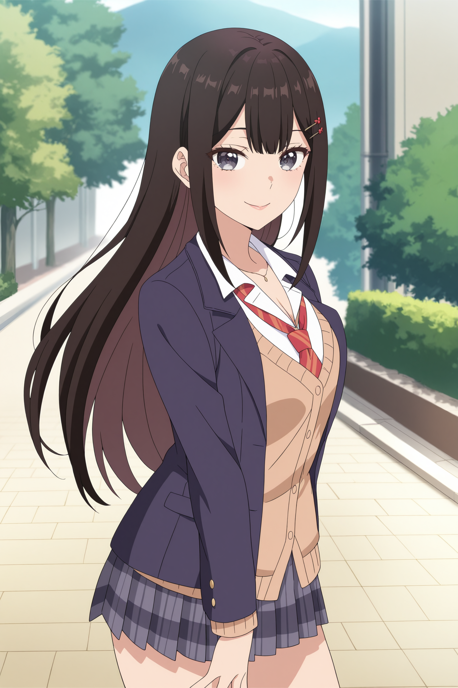 1girl, long hair, bangs, dark brown hair, hairclip, grey eyes, rion_enomoto