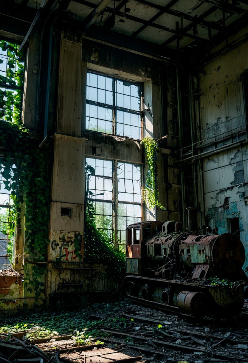 - "urbex abandoned factory, rusty machinery, broken windows, overgrown ivy, cinematic lighting, photorealistic"