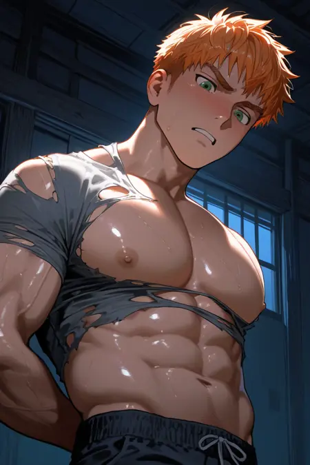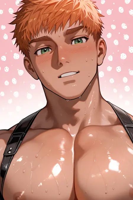 1boy, NapoliPizzaGuy, orange hair, green eyes, short hair, manly, muscular, bara,