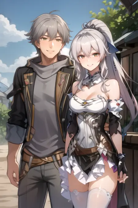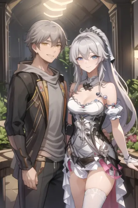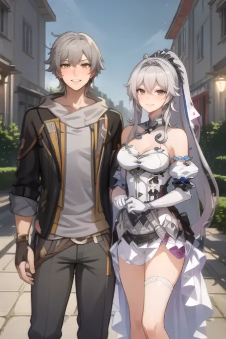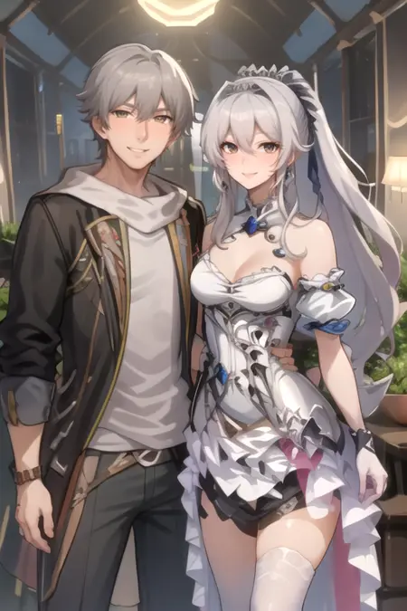 CaelusKiana, a man and a woman, hetero, standing, smile, cowboy shot