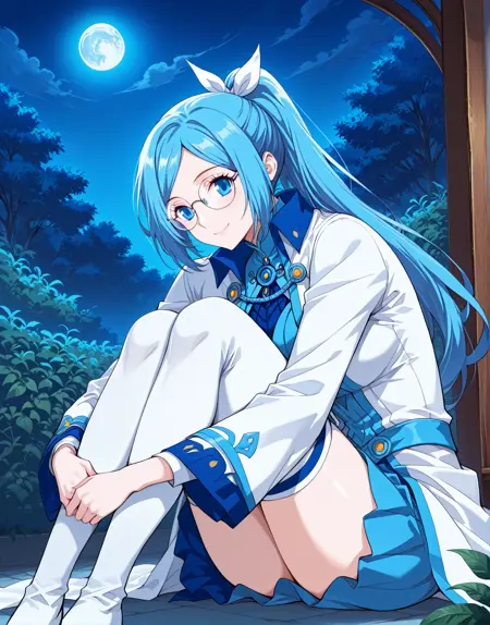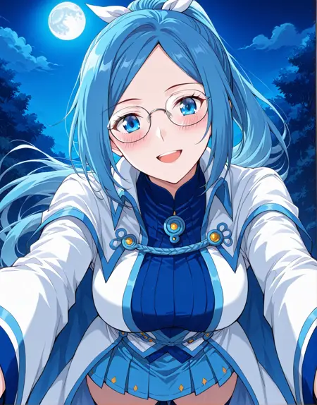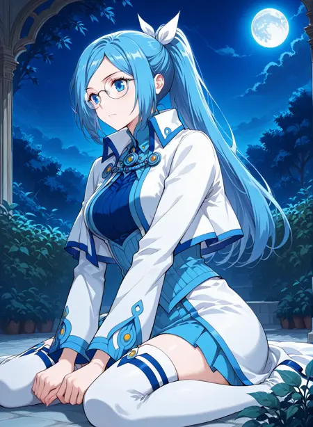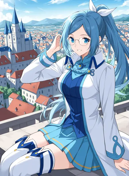 1girl, solo, blue hair, long hair, ponytail, hair ribbon, glasses, round glasses, blue eyes, anime style