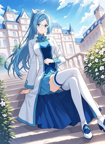 magic academy uniform, scholar, elegant, white and blue outfit, high collar, long sleeves, white sleeves, layered clothing, blue skirt, white robe, formal dress, thigh-highs