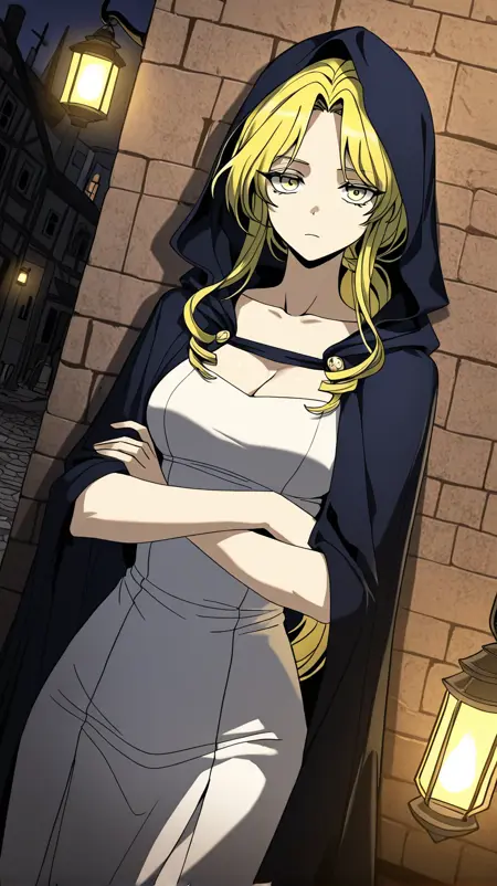 penelope_night_outfit, white shift dress, collarbone, cleavage, dark blue hooded cape,