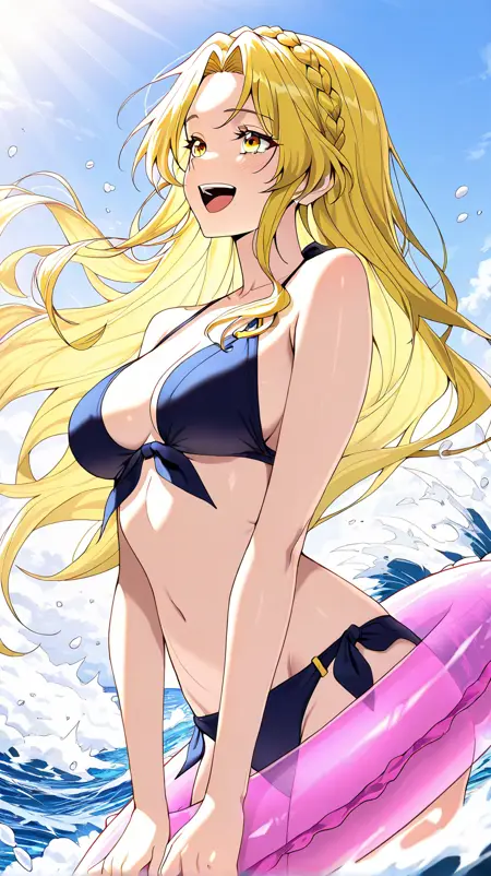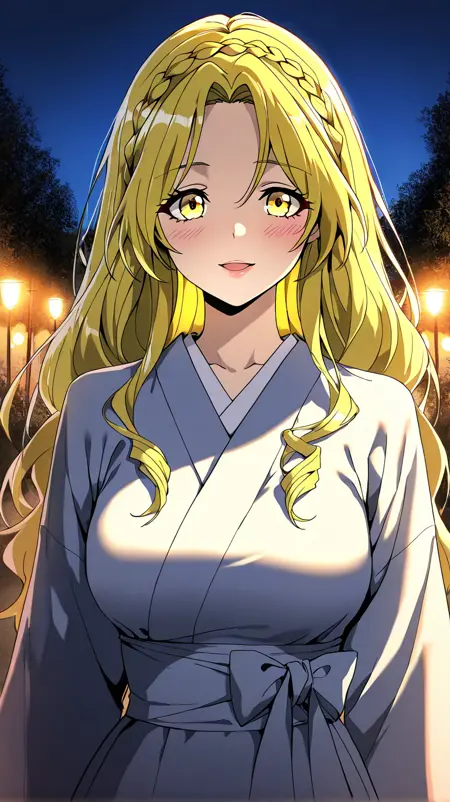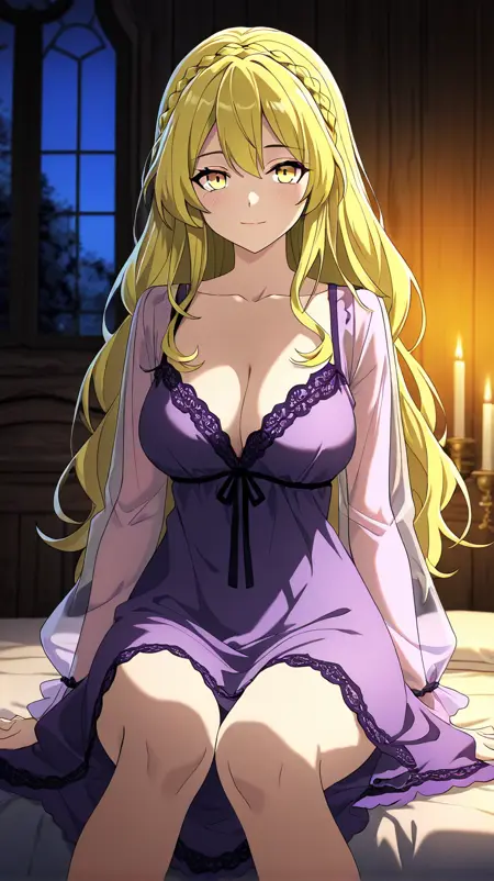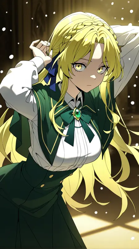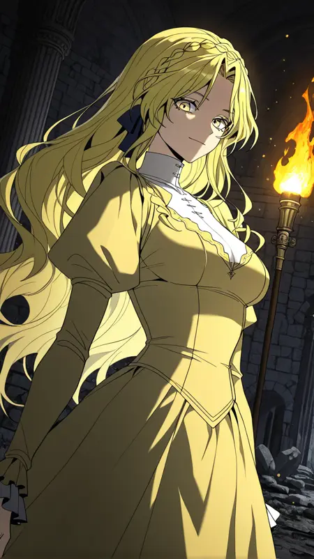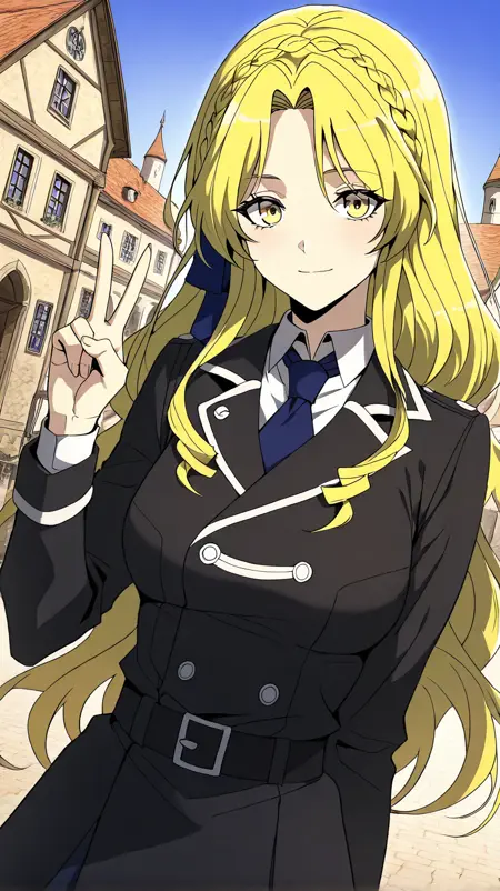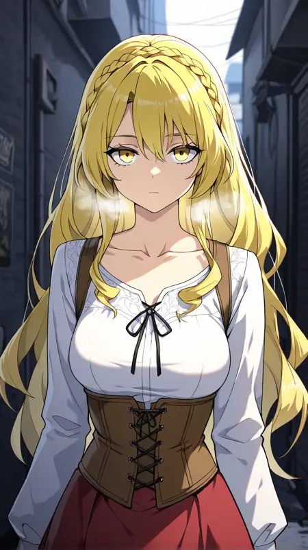 1girl, solo, il_penelope, yellow eyes, long hair, side braid, low ponytail, blonde hair, curly sidelocks, medium breasts,
