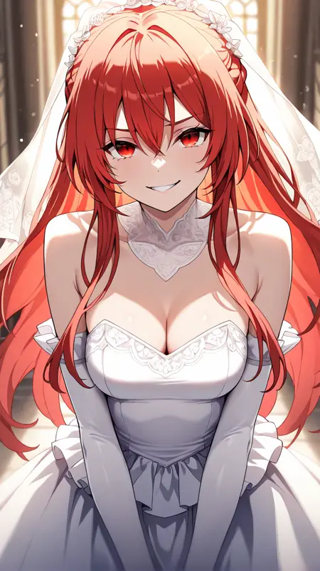 1girl, solo, il_talia, red eyes, red hair, long hair, sidelocks, bangs, hair between eyes, medium breasts,