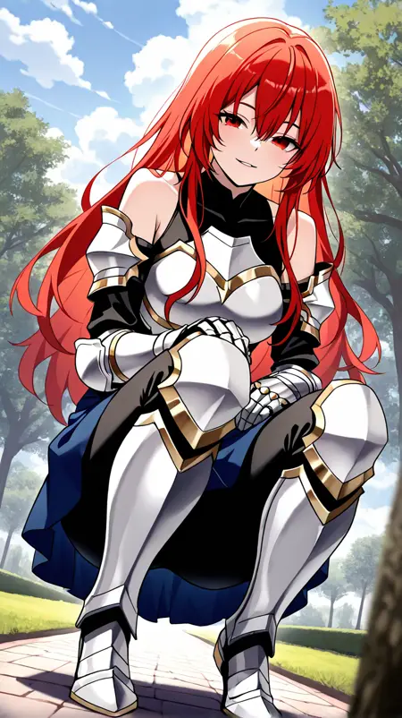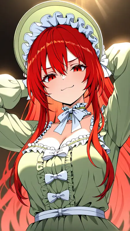 1girl, solo, il_talia, red eyes, red hair, long hair, ponytail, sidelocks, bangs, hair between eyes, medium breasts,