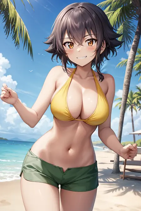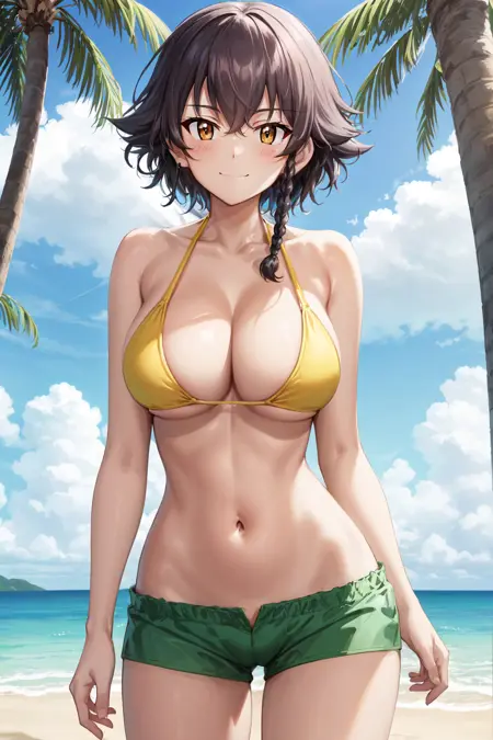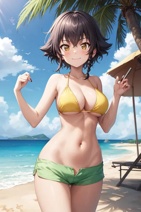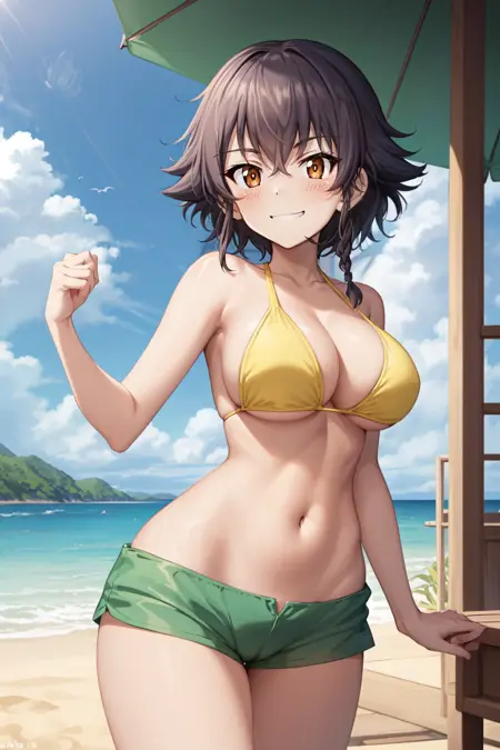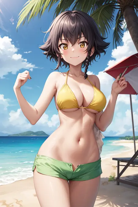 プロモーション資料での水着: マッチしていないビキニ、黄色のビキニ、ビキニショーツ、緑のビキニ、短いショーツ、緑のショーツ、ハーネック。