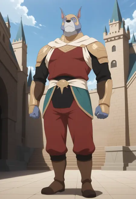 주요 복장: 금색 헬멧, 고르겟, 빨간 셔츠, 감싼 천, 팔더런, 검은 언더셔츠, 바미브레이스, 검은 허리 갑옷, 녹색 허리cloth, 빨간 바지, 그리브스, 갈색 부츠,