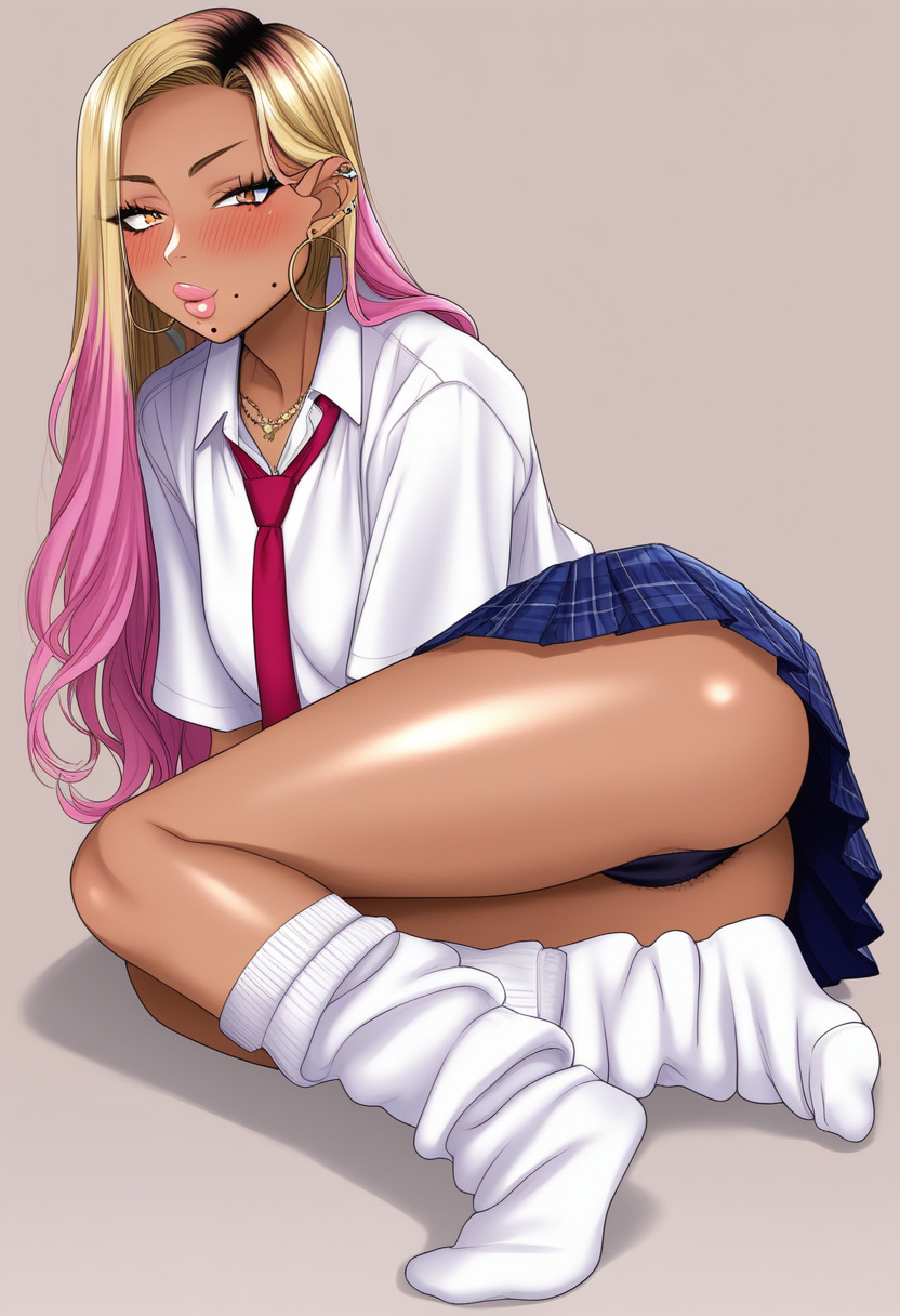 例えば:,blush,skirt,shirt,jewelry,school uniform,ass,thighs,multicolored hair,pleated skirt,earrings,necktie,socks,collared shirt,mole,dark-skinned female,mole under mouth,hoop earrings,gyaru,loose socks