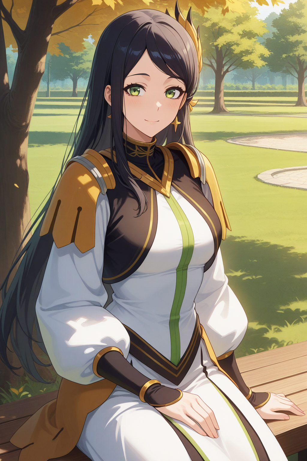 aaheejin, green eyes, black hair, long hair, heejindress, yellow hair ornament, hair ornament, black collar, yellow shoulder pads, dress, white top, puffy long sleeves, anime coloring,