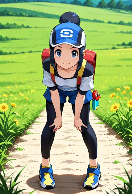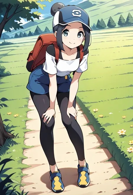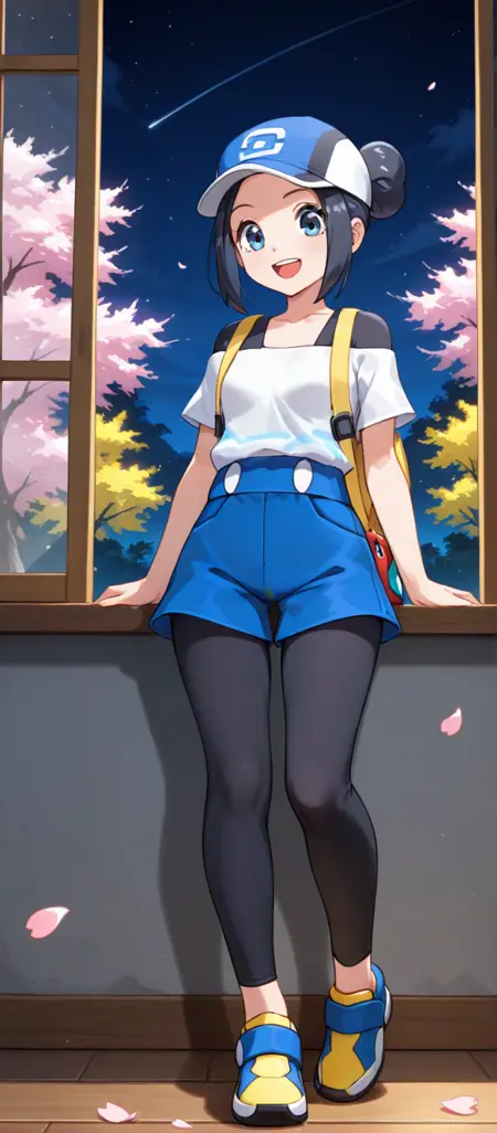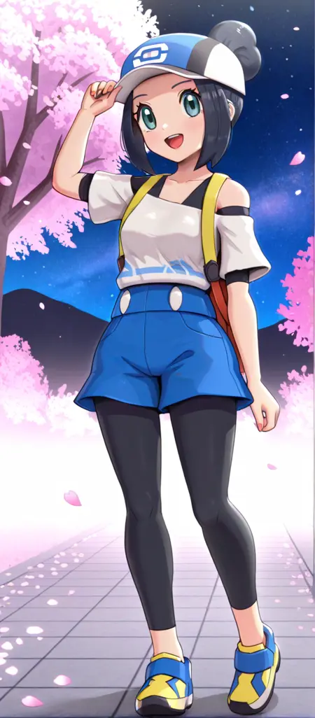pkbettie, black hair, grey eyes, short hair, sidelocks, bangs, single hair bun, baseball cap, blue headwear, white shirt, collarbone, black undershirt, short sleeves, off-shoulder shirt, high-waist shorts, blue shorts, black leggings, leggings under shorts, shoes, blue footwear, yellow footwear