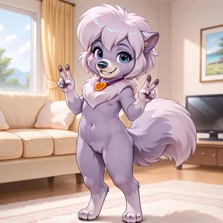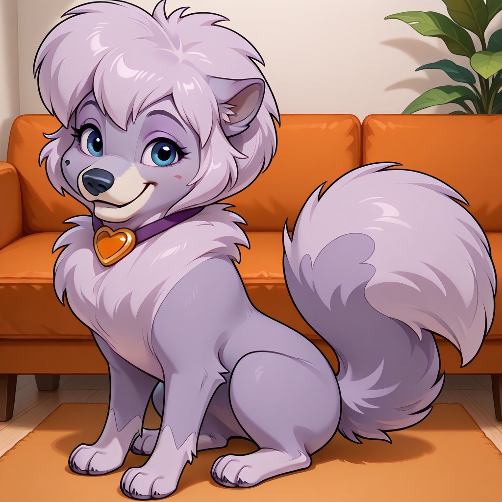 dog, pomeranian, purple and white fur, short hair, bangs, blue eyes, dog tail, fluffy tail, black nose, necklace, heart pendant,