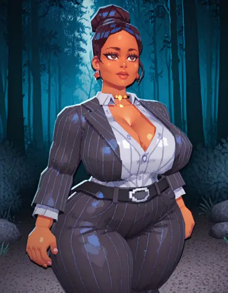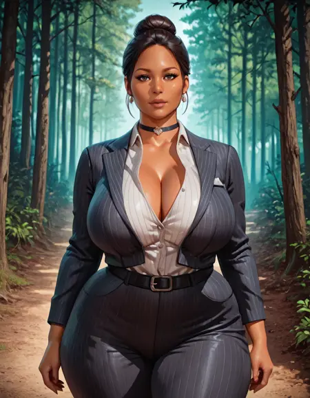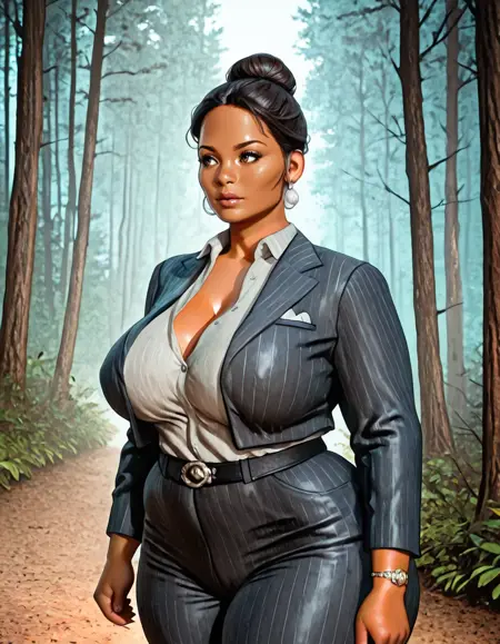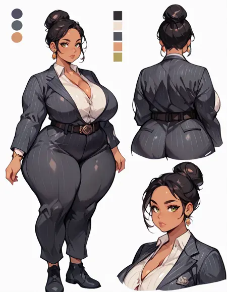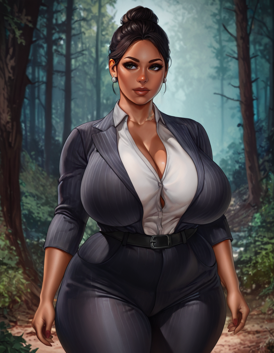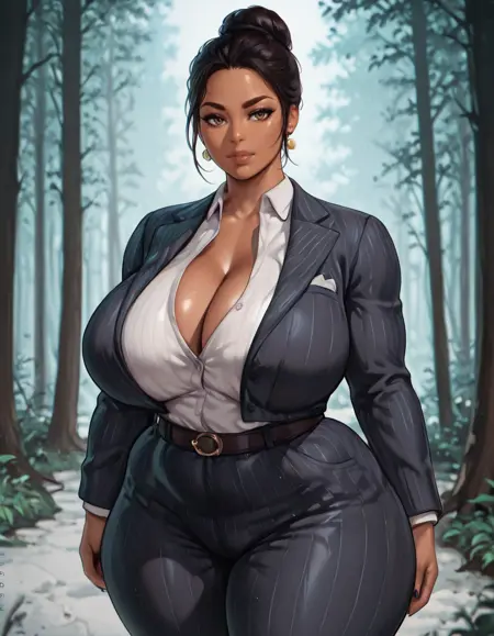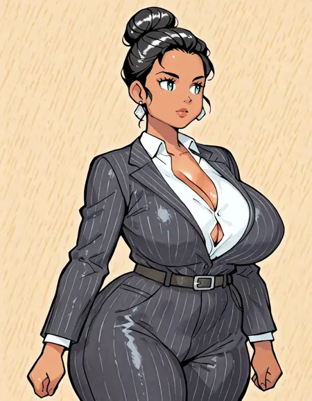 1girl, single hair bun, hair bun, solo, jewelry, formal, suit, belt, pants, pinstripe pattern, curvy, shirt, cleavage, striped, earrings, thick thighs, dark skin, jane romero,