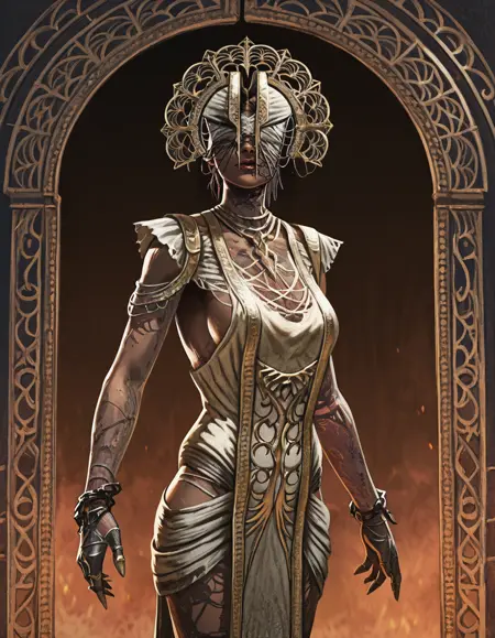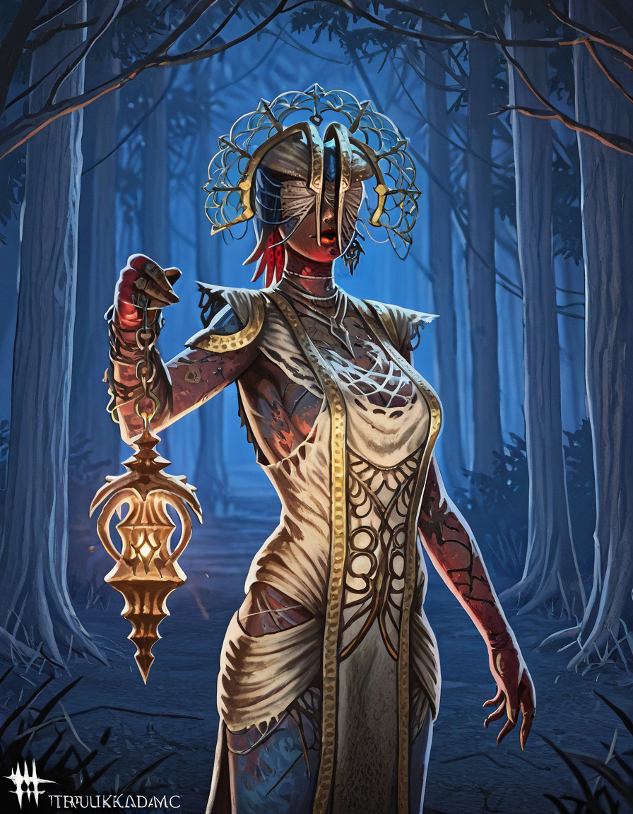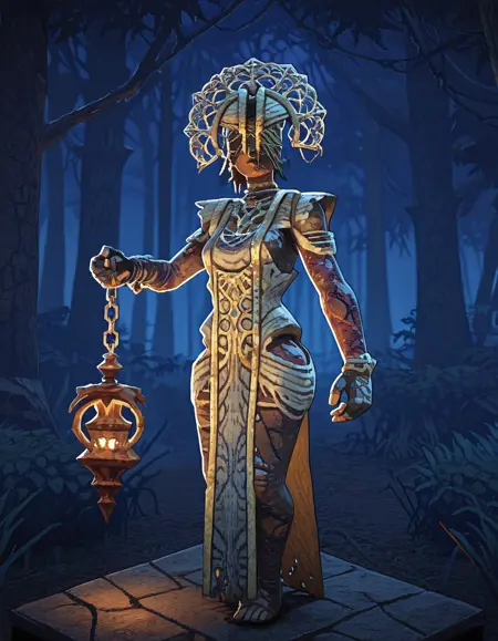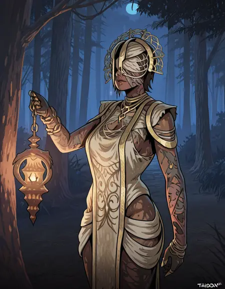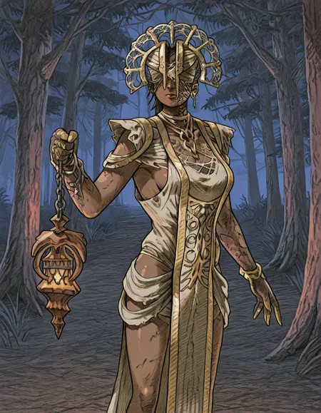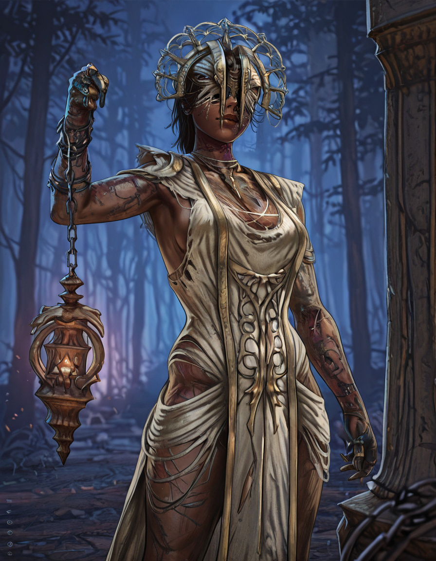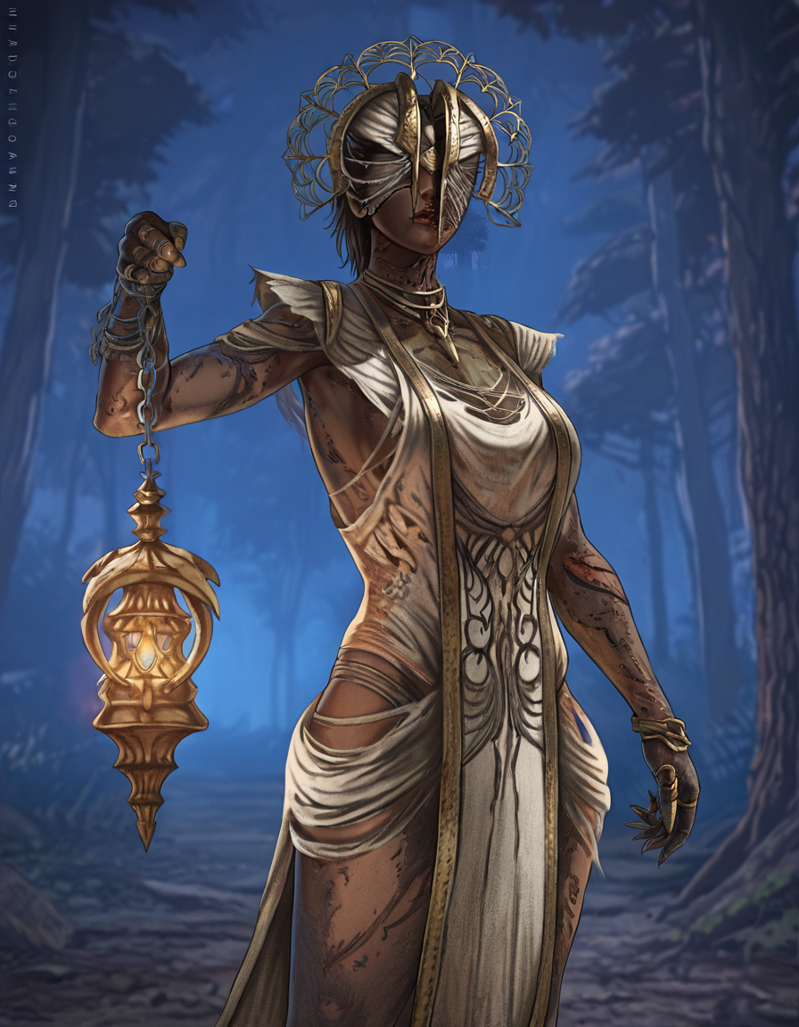 1girl, solo, jewelry, dark skin, dress, dark-skinned female, chain, covered eyes, the plague, torn clothes, lantern, holding, burned face,