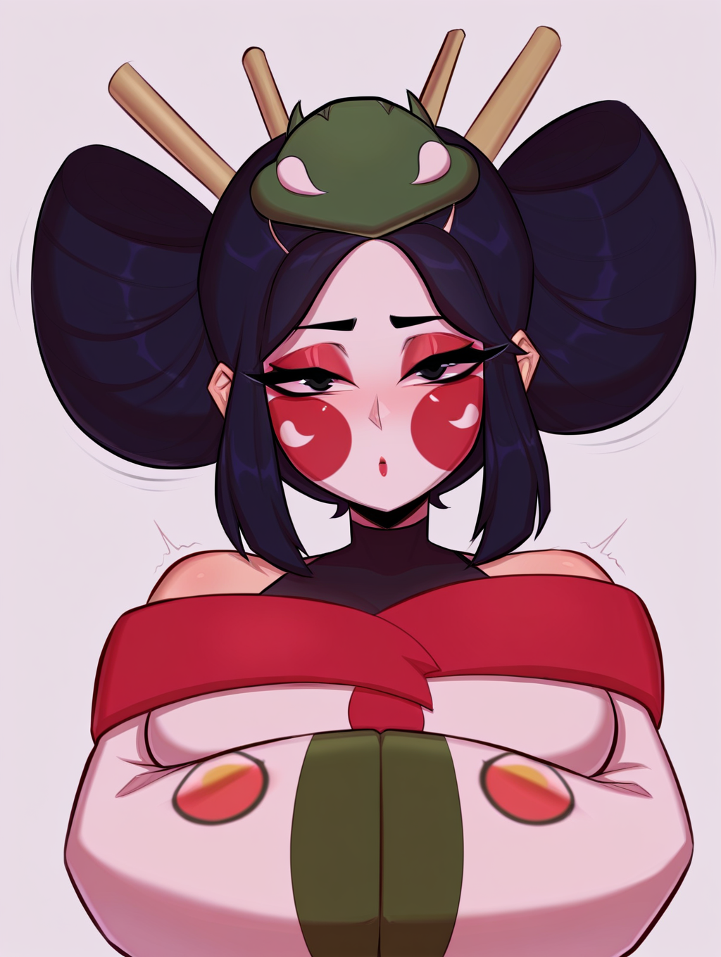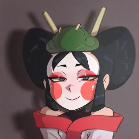 카제 주요 태그: KazeBS, 1girl, facepaint, makeup, facial mark, black hair, hair stick, holding folding fan