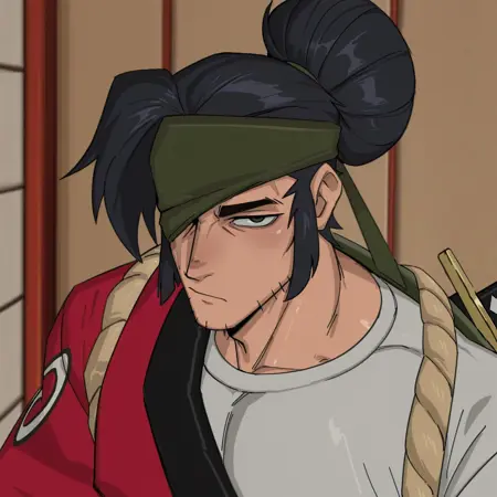 켄지 주요 태그: kenjiBS, 1boy, black hair, hair bun, single hair bun, headband, one eye covered, scar, scar on face, kimono, holding weapon, katana