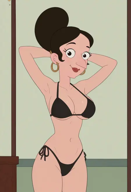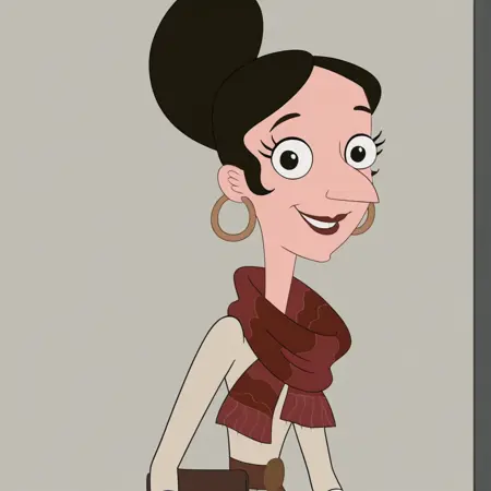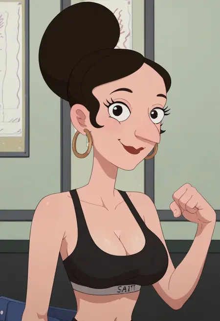 1girl, solo, MsMurawski_MML, fair skin, black eyes, prominent nose, dark brown hair, high hair bun, two long hair curls, gold hoop earrings