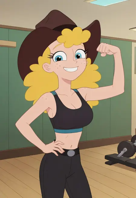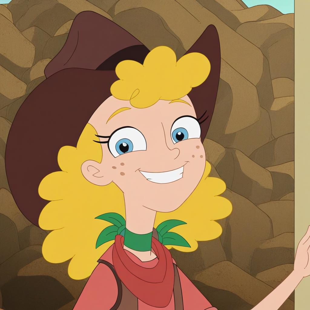 1girl, Solo, Jackie_MML, 白皙皮肤,雀斑,小巧尖鼻,浅蓝色眼睛,明亮金色头发,浓密卷发,棕色牛仔帽