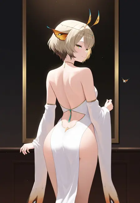 "Sanagi Yuzu (蛾虫ユズ) is a silk moth spirit based on the Japanese Silk Moth. She was farmed for her high quality silk for hundreds of years. While confined, she lost count of the of days she spent in her cell, which resulted in her forgetting her age and growing a distrust in humans. Her only salvation was a small moth spirit named "Koga" (translates to: "little moth" in Japanese) who would share a Yuzu fruit with her on a nightly basis. Suddenly, Koga stopped showing up for weeks, and she feared the guards may have caught him. She was then suddenly freed by a mysterious figure and found Koga waiting under the Yuzu tree for another fruit to pick. She explained Koga went missing because he was waiting for the tree to bear more fruit as it was out of season. As for the mysterious figure, she explained on her debut stream that it was Gojo Satoru from Jujutsu Kaisen who broke her out, and that he is "packing." She now streams from a shrine in the spirit realm to determine if she can return to live with humans once again."