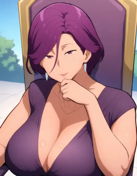 图像提示:成熟女性、熟女、紫色头发、紫色连衣裙、巨乳、深邃乳沟、V领、超精细、高质量