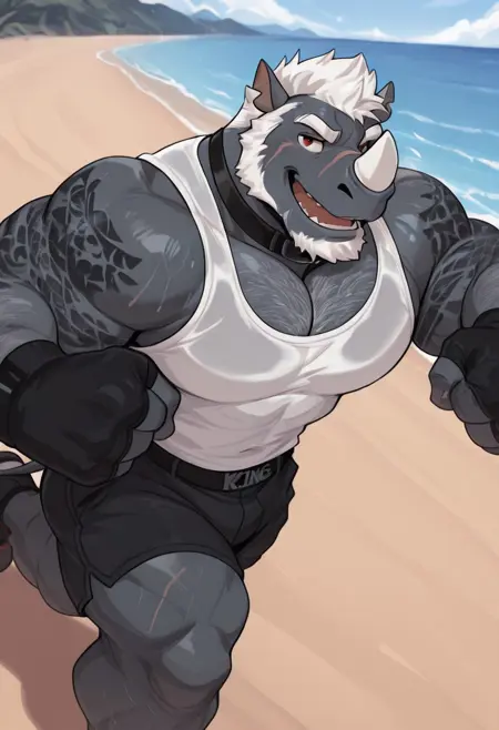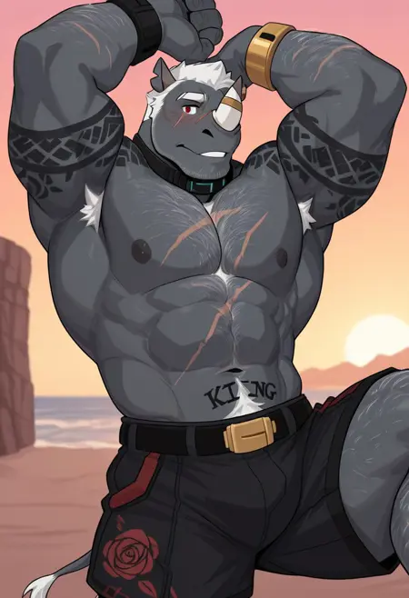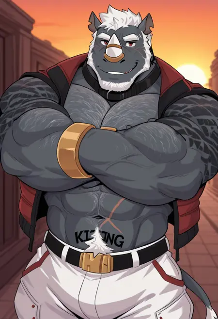 单人,K1NG,犀牛男孩,白发,灰色身体,鼻角上金色手镯,后颈条形码,项圈,K1NG纹身,体毛,疤痕,K1NG身体,红色背心,长裤,腰带,毛茸茸的男性,肌肉男性,白发,