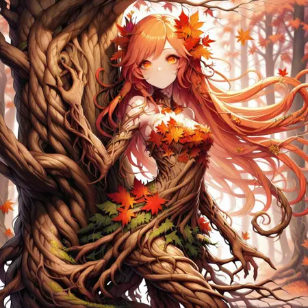 Maple_Aurielle, orange eyes, orange hair, hair ornament, maple leaf, orange dress, inhuman legs,