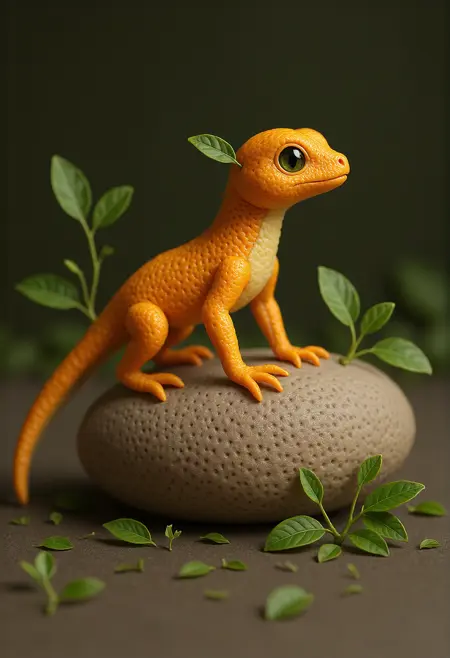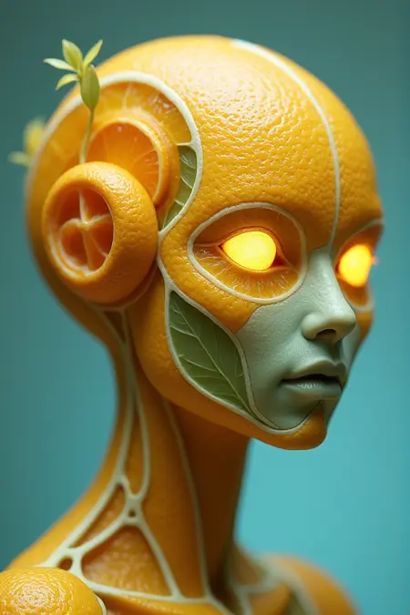 Use normal structure: "A [subject] made from lemon peel, covered in water droplets."