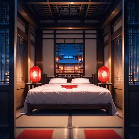 触发词:eabober,风景,东亚建筑,格子窗,红纸灯笼,卧室,大床