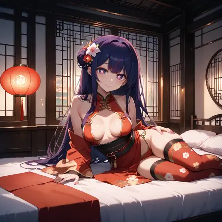 触发词:eabober,风景,东亚建筑,格子窗,红纸灯笼,卧室,大床