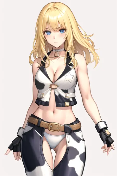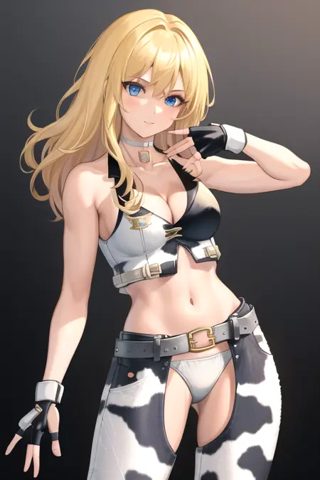 DixieClemets, 1girl, solo, blonde hair, cow print, chaps, fingerless gloves, blue eyes, medium breasts, white panties, midriff, choker, long hair, cleavage, navel, crop top, bare shoulders, belt