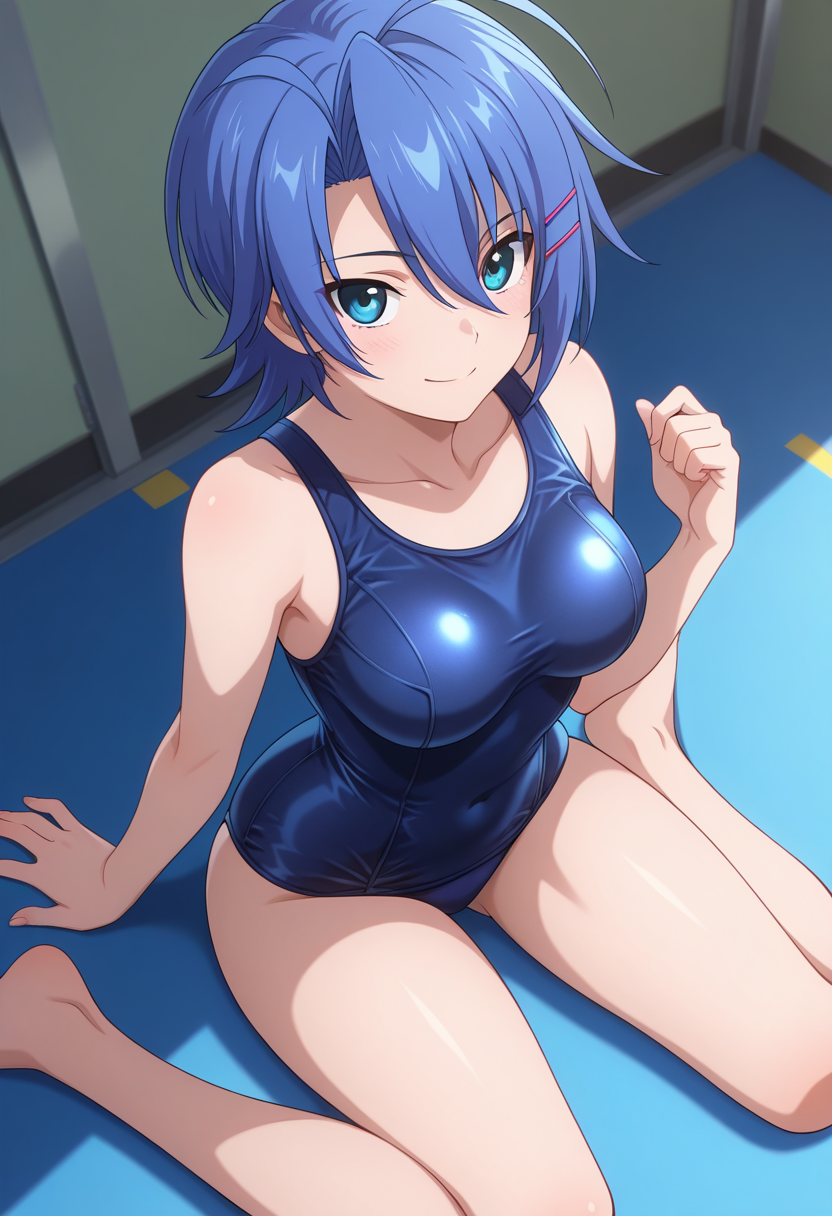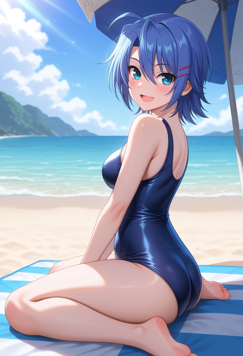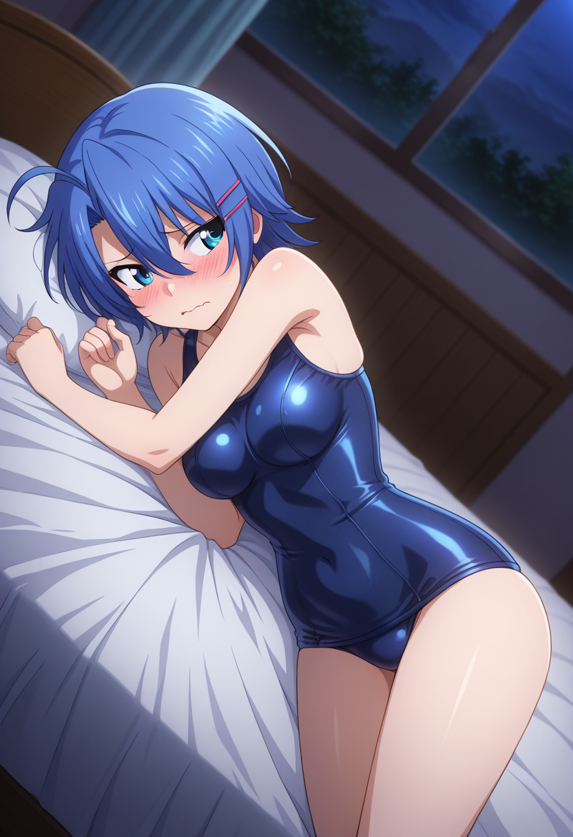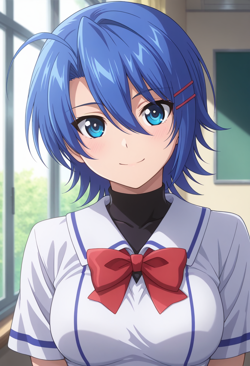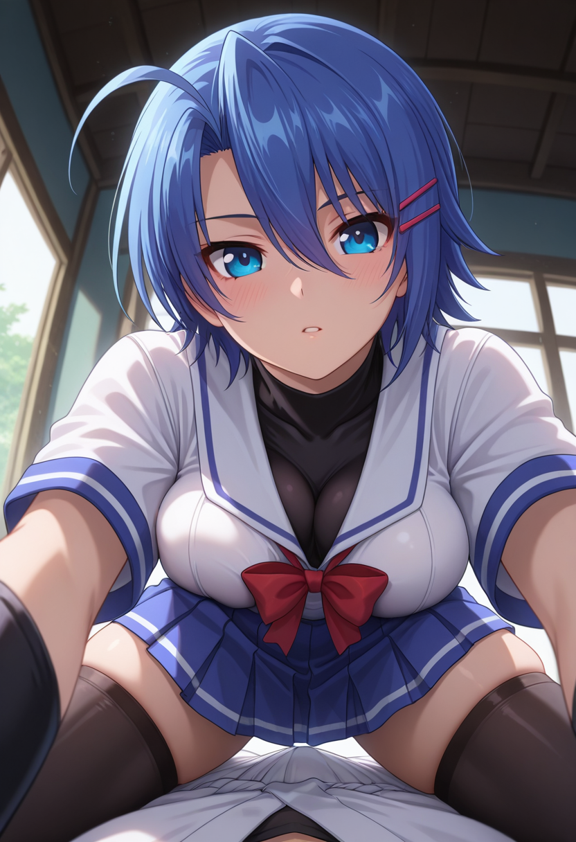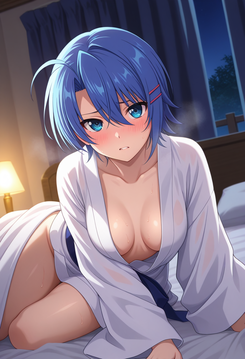 - junkoww, 蓝眼睛, 蓝发, 短发, 发丝遮眼, 天线辫, 发夹, 中等胸部