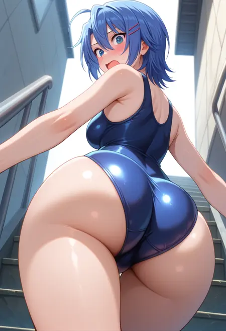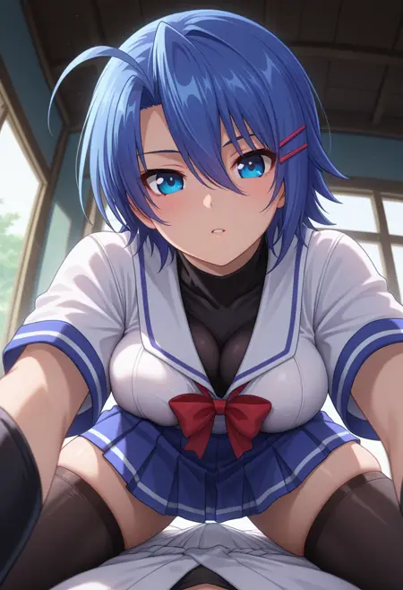- junkoww, blue eyes, blue hair, short hair, hair between eyes, ahoge, hairclip, medium breasts,