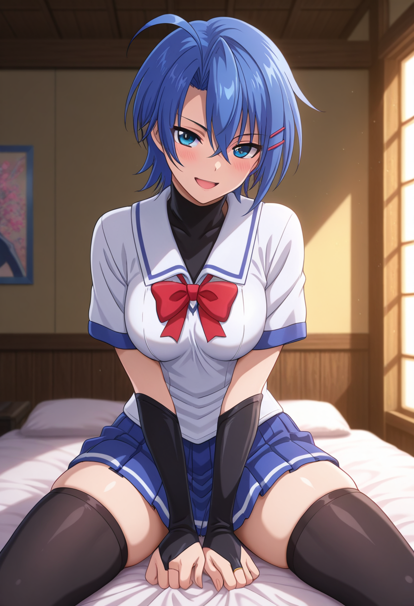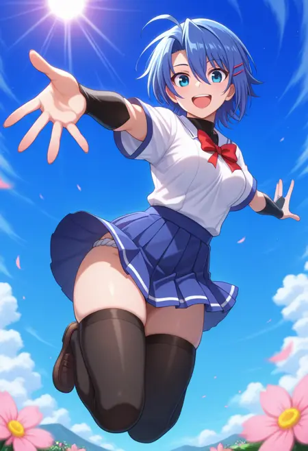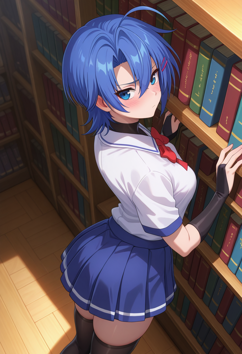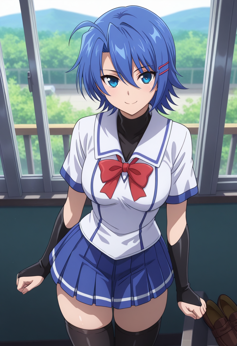 - 校服, 高领, 黑色内搭, 白色校服衬衫, 短袖, 红色蝴蝶结, 黑色新娘手套, 无指手套, 蓝色百褶裙, 黑色过膝袜, 绝对领域, 乐福鞋