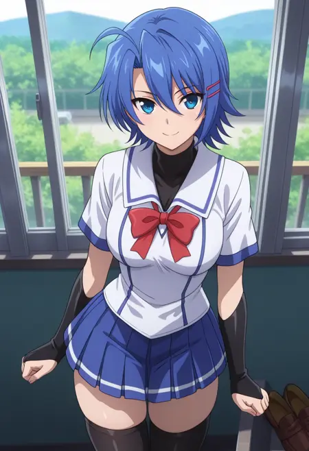 - school uniform, turtleneck, black undershirt, white school shirt, short sleeves, red breasts bow, black bridal gauntlets, fingerless gloves, blue pleated skirt, black thighhighs, zettai ryouiki, loafers,