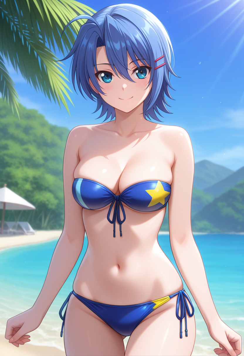 - 泳装, 蓝色比基尼, 星星图案, 胸部, 胸部沟壑, 无肩带, 前系带上衣, 无吊带, 侧系带比基尼下装