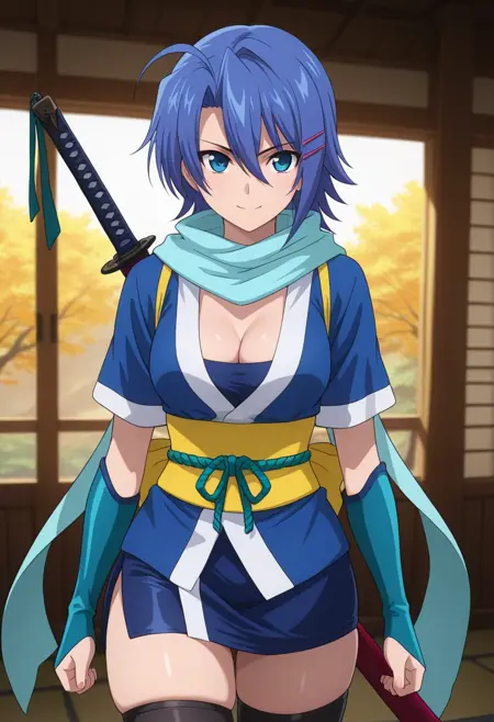 - 忍者, 水蓝色围巾, 胸部, 胸部沟壑, 蓝色短和服, 蓝色迷你裙, 黄色腰带, 黄色后背蝴蝶结, 浅绿色肘套, 黑色过膝袜, 蓝色腿部护甲