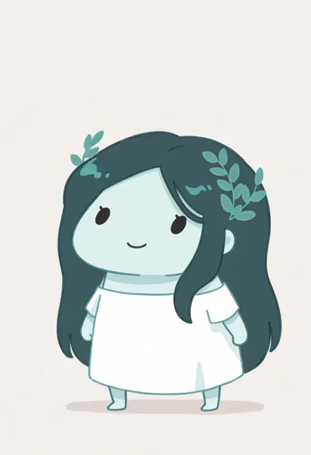 プロンプト: Lesya-vkstickrs、薄いタイル色の肌、長い流れるような濃い緑の髪、黒い目、赤い虹彩、白い片肩ドレス、髪に月桂樹の葉