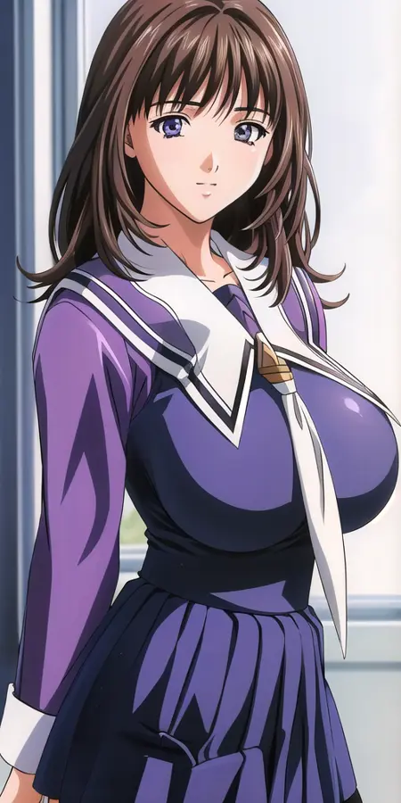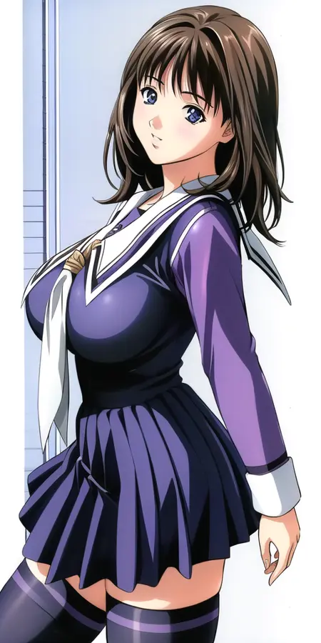 - School_uniform_Purple_shirt_Blue_skirt_White_neckerchief_Black_thighhighs: 彼女の学校制服。