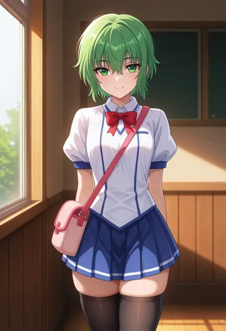 - 학교 유니폼, 빨간 리본넥타이, 흰색 학교 셔츠, 반소매, 파란 접힌 스커트, 제타이 리ョ우이키, 검정 허벅지 양말, 로퍼, 로퍼,