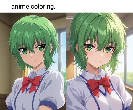 프롬프트에 "anime coloring"을 사용하면 애니메이션 분위기에 더 가까워집니다.