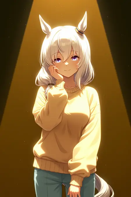 白髪、長髪、馬の尾、馬の耳、馬娘、青い目、耳飾り、