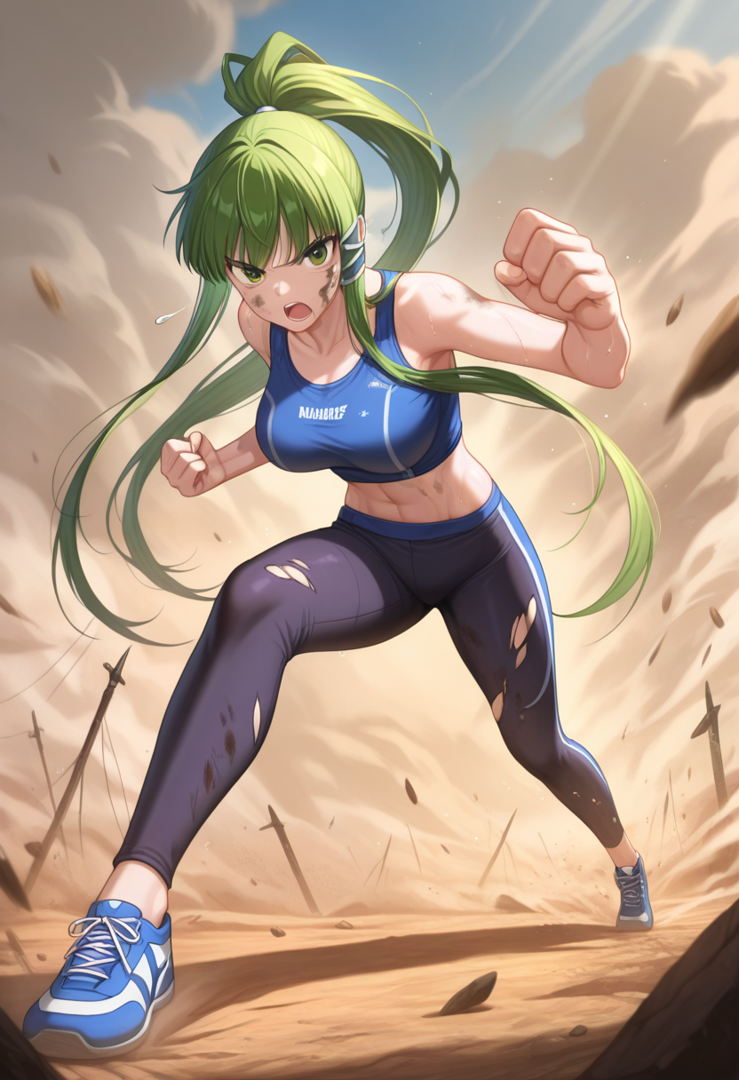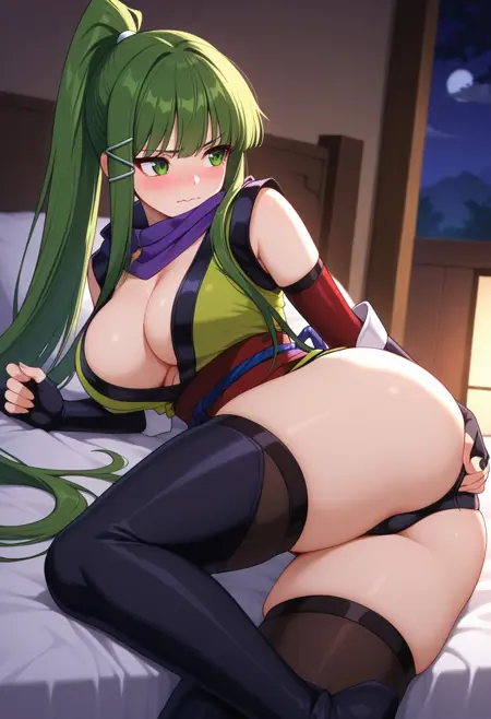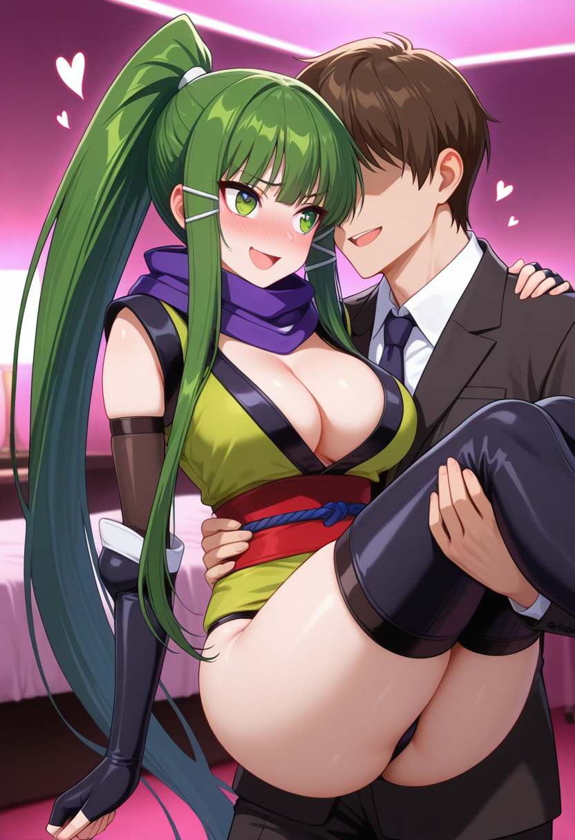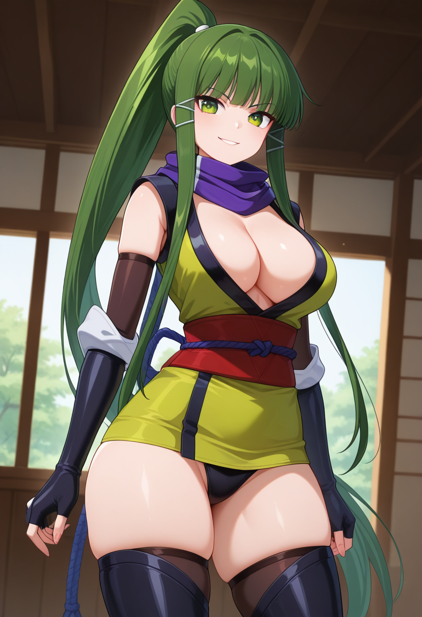 • 忍者, 乳房, 深V, 紫色围巾, 绿色和服, 红色腰带, 黑色内裤, 黑色肘套, 无指手套, 黑色长靴