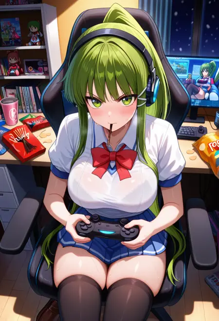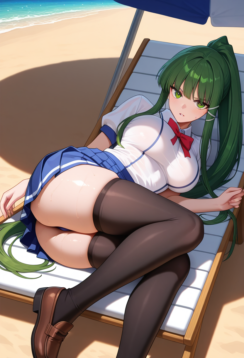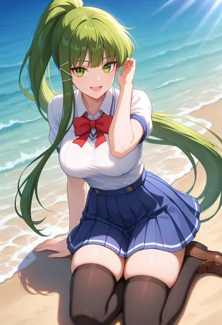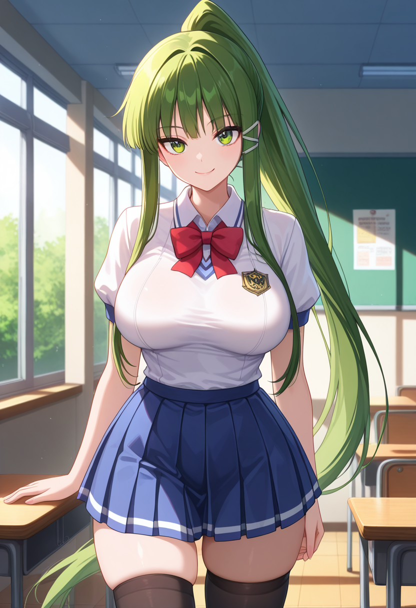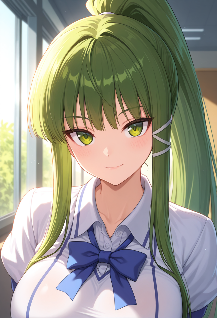 • eikoww, 绿眼睛, 绿发, 长发, 极长发, 马尾, 侧发, 头饰, 大乳房