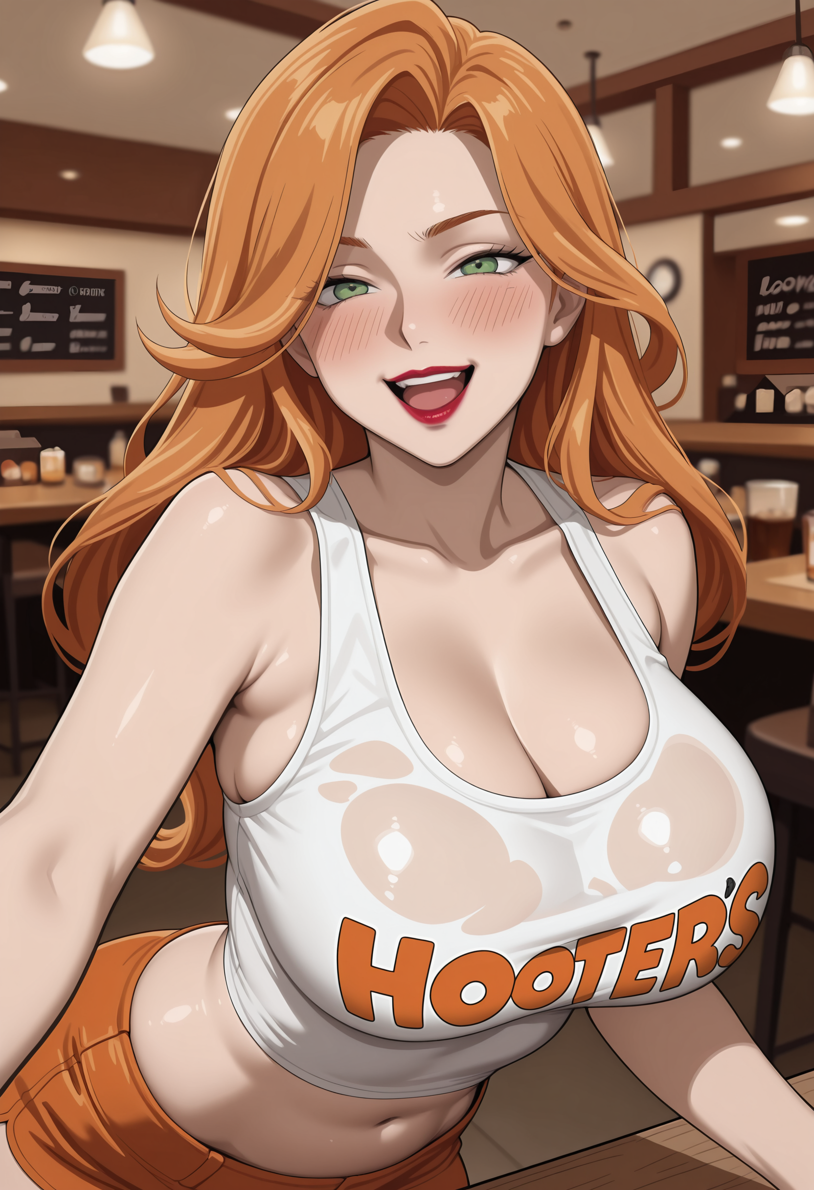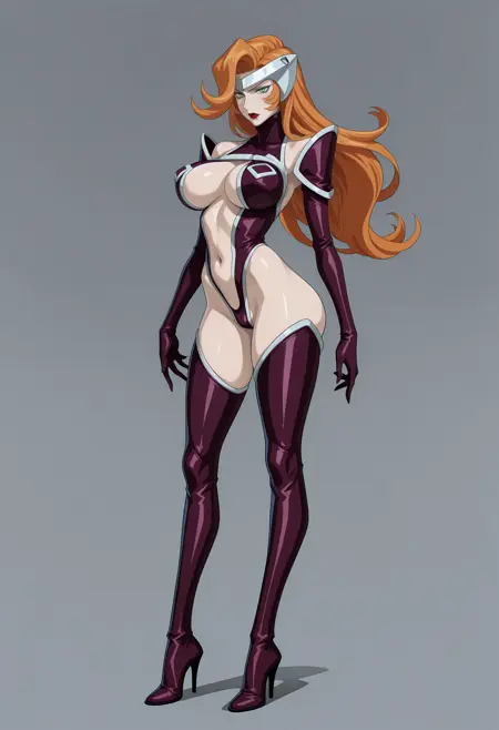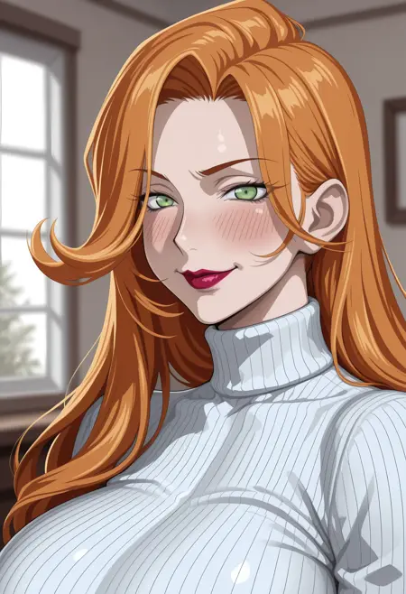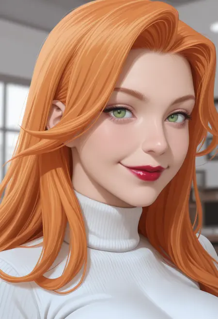 3kilf, 1girl, 橙色头发, 长发, 绿色眼睛, 口红, 额头护具, 中开式, 手套, 大胸, 胸部