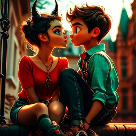Features expressive characters with large eyes, sculpted hair, and warm cinematic lighting. Textures are soft yet detailed—porcelain skin, rich fabrics, glowing backdrops.